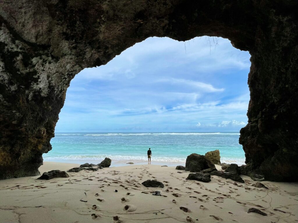 A visit to Uluwatu Beach is as much about the journey as the destination. Descend through narrow stone staircases and past local surf shops before stepping into Suluban Cave—a dramatic natural tunnel where light filters through cracks in the rocks. At low tide, the cave opens to a secret stretch of sand that feels cinematic.